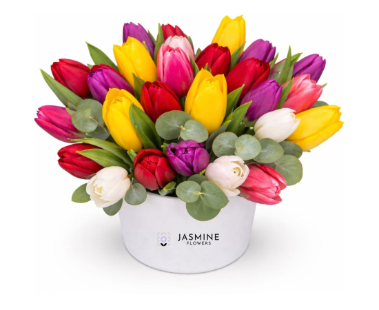 Un aranjament floral elegant și plin de viață, compus din 29 de lalele multicolore atent selecționate, completate armonios de frunze parfumate de eucalipt. Combinația vibrantă de culori transmite energie, prospețime și bucurie, fiind alegerea perfectă pentru a surprinde pe cineva drag sau pentru a aduce un strop de primăvară în orice spațiu.
