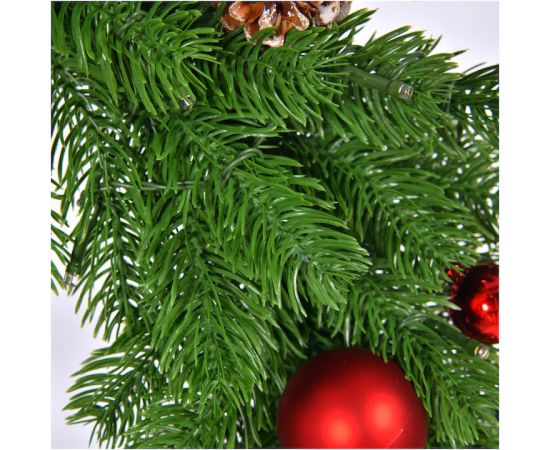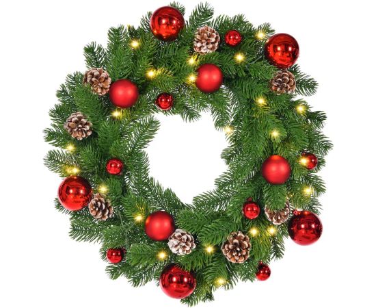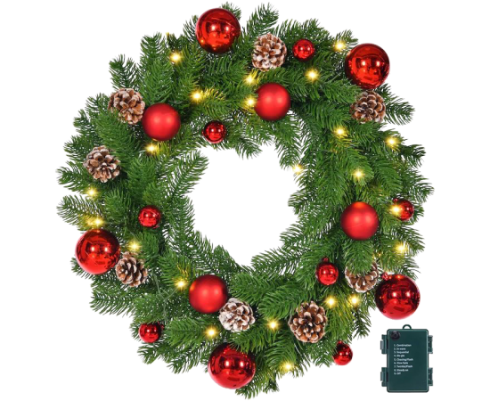 Adaugă un strop de magie sărbătorilor cu această coroană de Crăciun premium, decorată cu globulețe roșii și conuri naturale de brad. Coroana este realizată din ramuri de brad natural, oferind prospețime și un parfum autentic de sărbătoare. Luminitele cu baterie creează o atmosferă caldă și primitoare, perfectă pentru a întâmpina familia și oaspeții în această perioadă festivă.