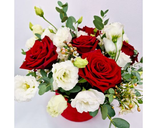 Un aranjament cu flori în cutie – Atingere de Catifea este cadoul ideal pentru a transmite rafinament, eleganță și emoție. Compoziția de flori – 7 trandafiri, 4 lisianthus, eucalipt și chamelaucium (wax flower) – creează un aranjament sofisticat, cu texturi și culori armonioase, perfect pentru aniversări, zile de naștere, evenimente speciale sau pentru a surprinde persoana iubită cu un gest delicat și memorabil.