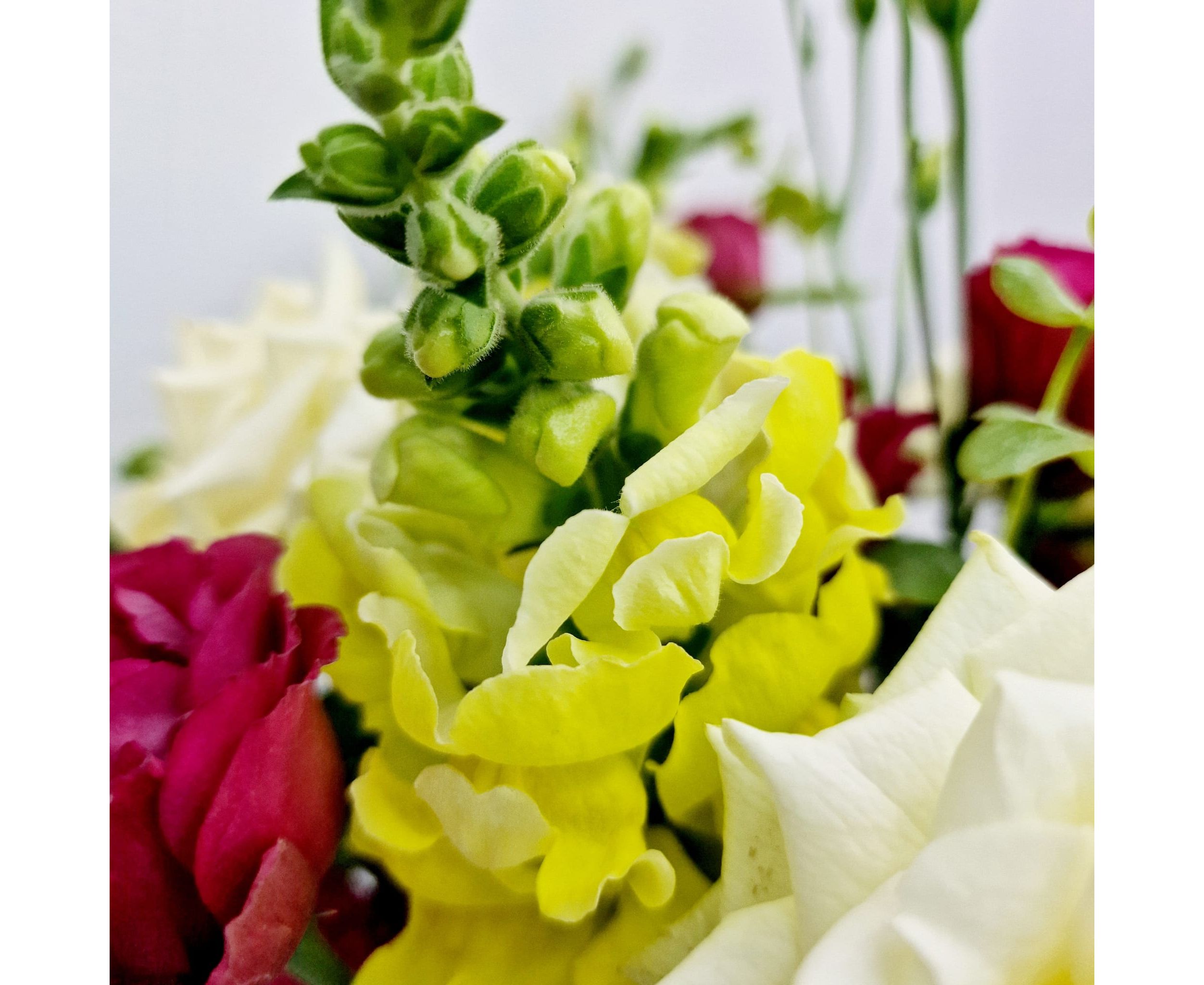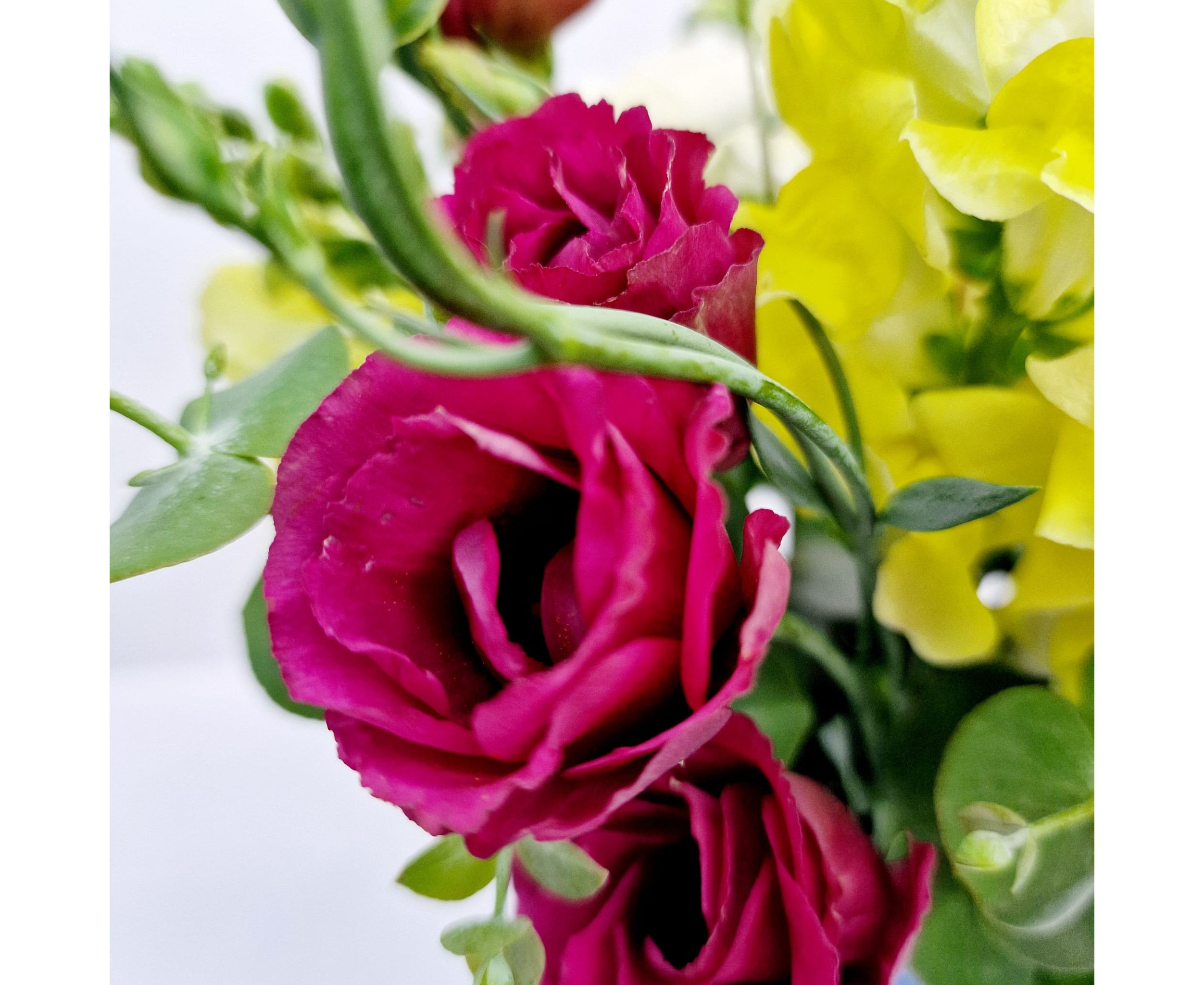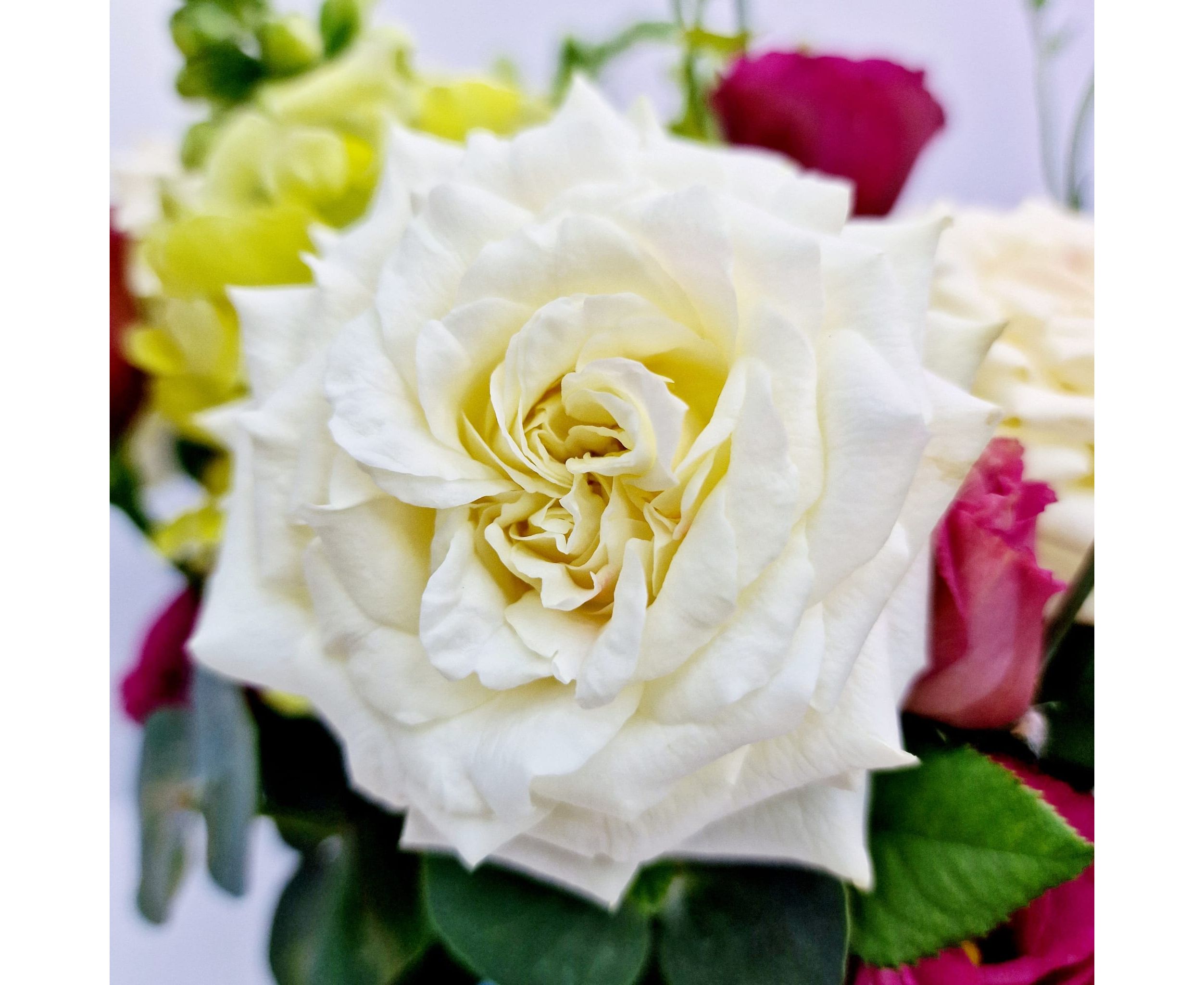 - Compoziție rafinată – 5 trandafiri albi, 5 gura leului, 7 lisianthus și eucalipt, pentru un buchet elegant și sofisticat.