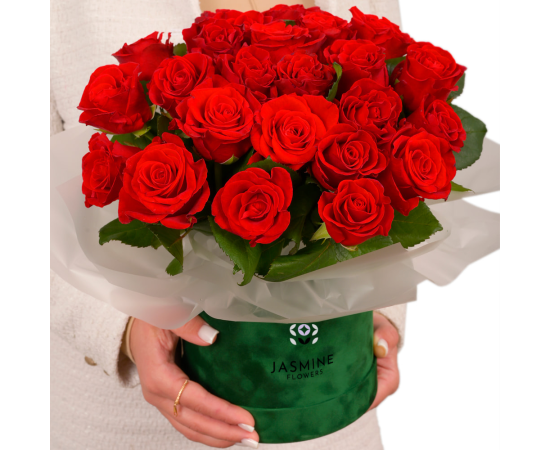 Cutia premium oferă un aspect modern și sofisticat, iar trandafirii roșii, simbol al pasiunii și dragostei profunde, transmit emoții puternice încă de la prima privire. Aranjamentul este realizat în burete floral hidratat, ceea ce asigură prospețimea florilor pentru o perioadă îndelungată.