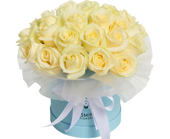 Aranjament floral în cutie cu 25 trandafiri "Snow White Love"