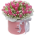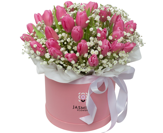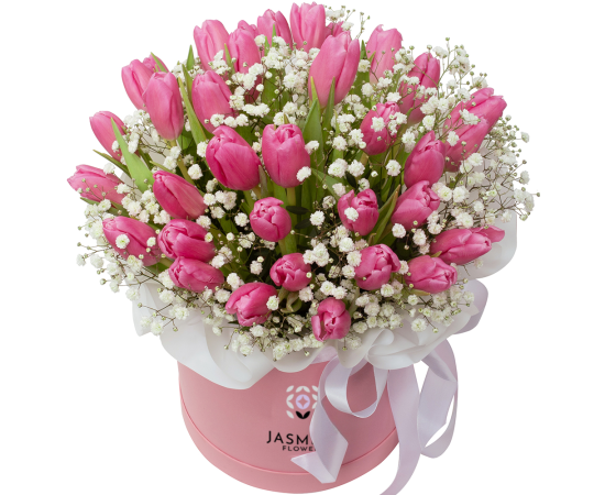 Un aranjament floral delicat și extrem de elegant, realizat din 35 de lalele roz proaspete, gypsophila (floarea miresei) și material floral premium, așezate într-o cutie decorativă diametru 19 cm.