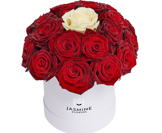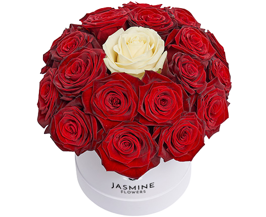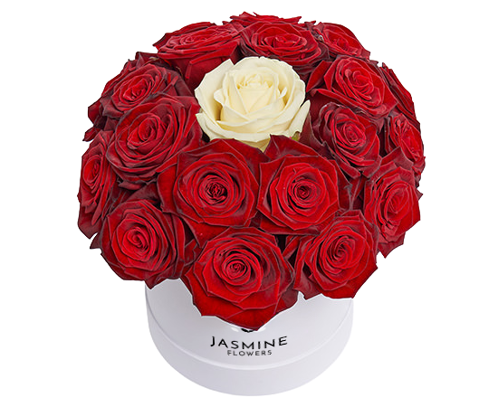 Acest aranjament floral în cutie cu 21 de trandafiri, realizat din 20 de trandafiri roșii și un trandafir alb central, este un simbol puternic al iubirii, pasiunii și al unui sentiment unic. Contrastul elegant dintre roșul intens și albul pur evidențiază trandafirul central, transformând aranjamentul într-un mesaj floral cu adevărat special.