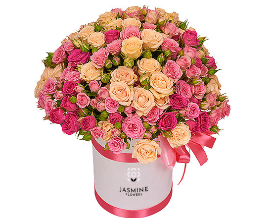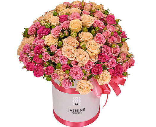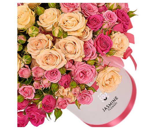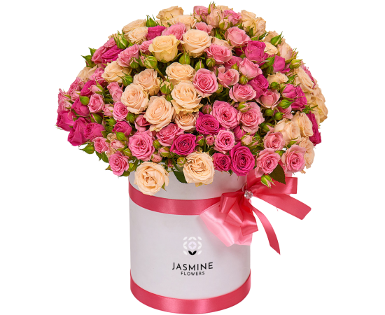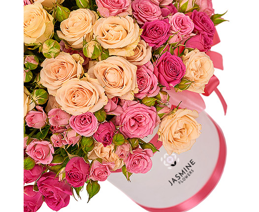 Aranjamentul floral în cutie cu 25 minirose roz și galben sau crem este o explozie de eleganță și rafinament, creat pentru a aduce bucurie și culoare în orice moment special. Combinația armonioasă dintre nuanțele calde (galben/cream) și tonul delicat de roz oferă un efect vizual vibrant, optimist și plin de feminitate.