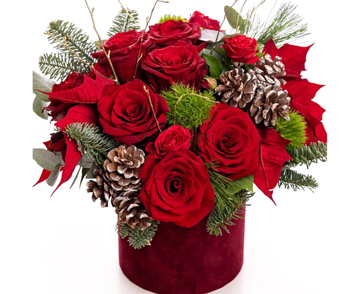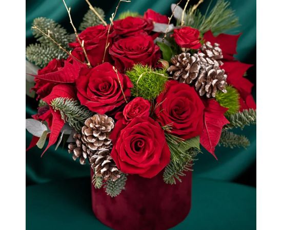 Aranjamentul de masă pentru Crăciun și Revelion este creat pentru a aduce în casa ta magia sărbătorilor de iarnă. Realizat cu 7 trandafiri roșii, 2 minirose roșii, crenguțe de brad nobilis, conuri naturale și accesorii festive, acest aranjament îmbină eleganța cu farmecul autentic al iernii.