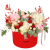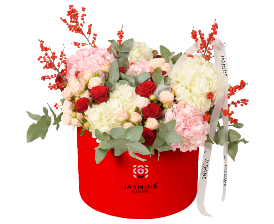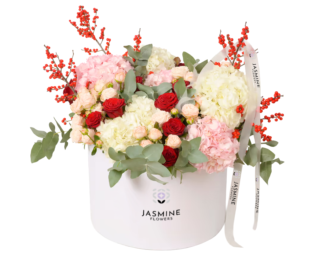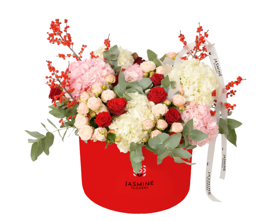 Acest Aranjament de Masă Crăciun – Revelion este o piesă florală luxuriantă, creată pentru a impresiona prin volum, culoare și eleganță. Combinația spectaculoasă dintre 3 hortensii roz, 3 hortensii albe, 11 ramuri de miniroze crem, 16 trandafiri roșii și accentele festive de ilex creează un aranjament bogat, perfect pentru masa festivă din sezonul sărbătorilor.