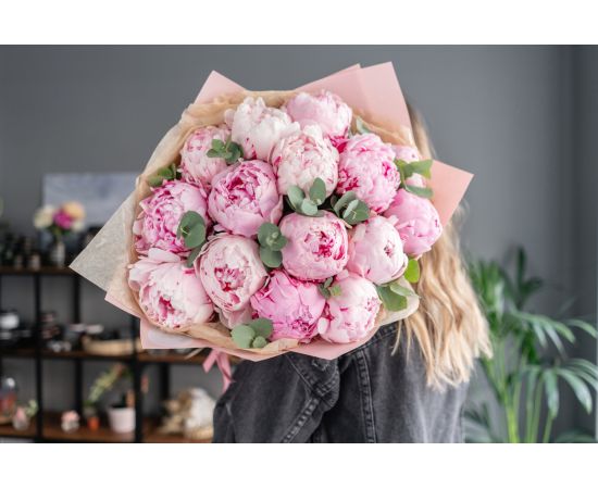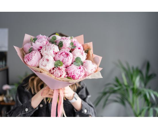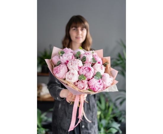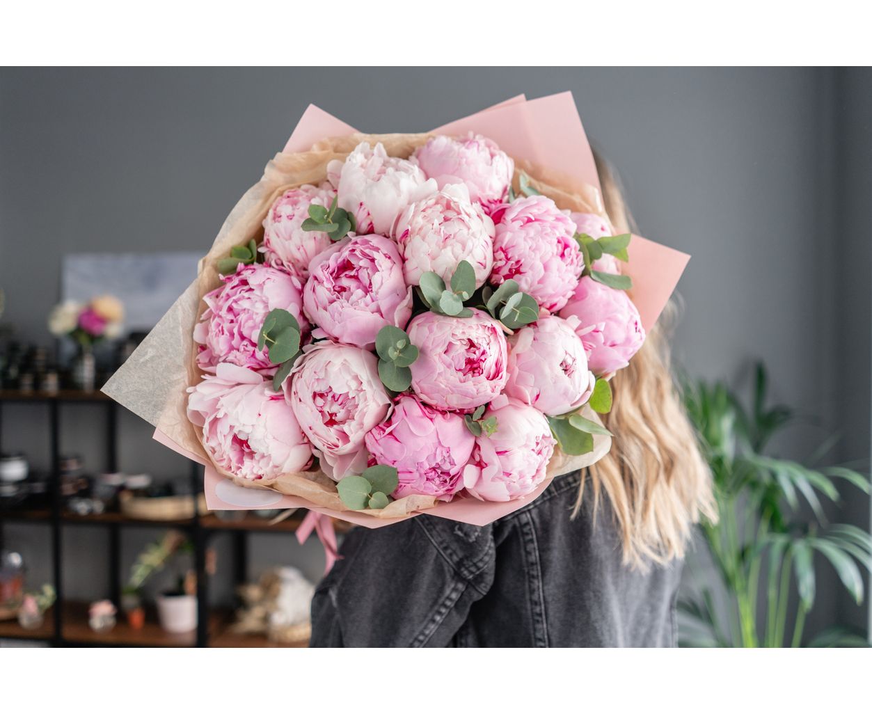 Flori incluse: 15 bujori roz premium, atent selecționați