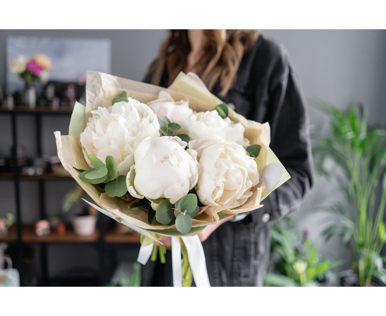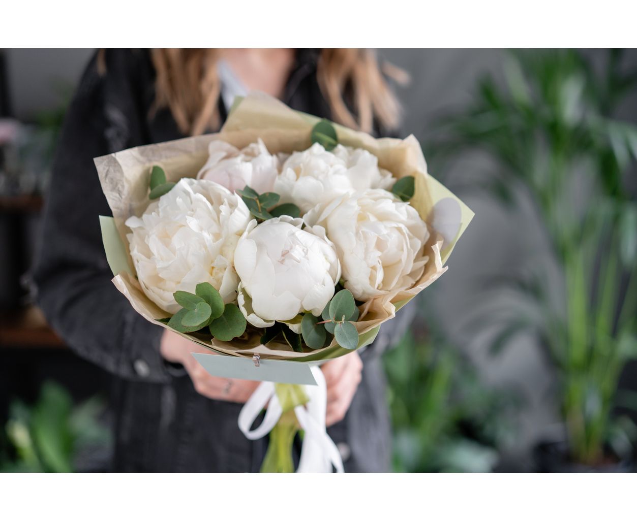 Flori incluse: 5 bujori albi premium, atent selecționați
