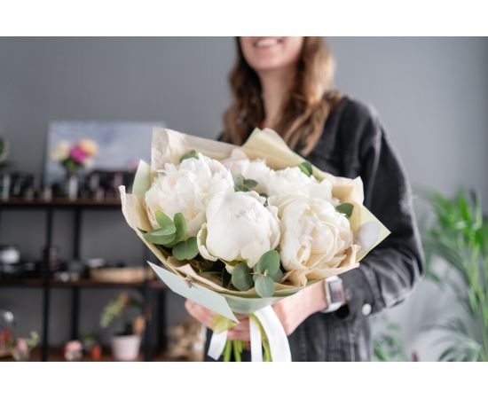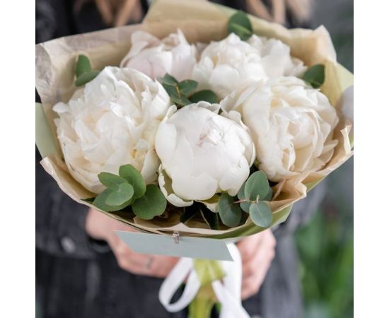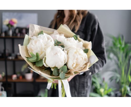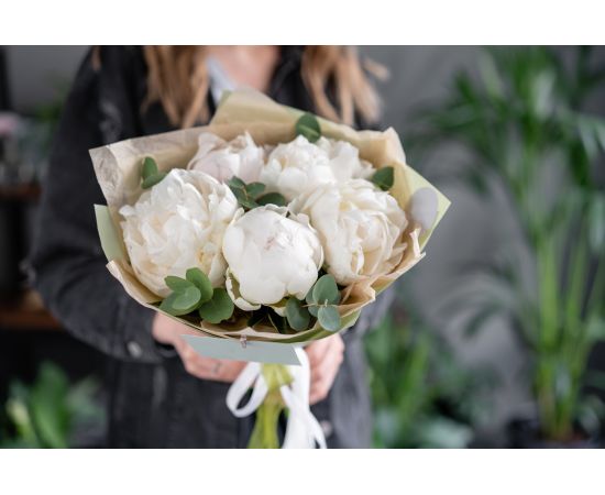 • Flori incluse: 5 bujori albi premium, atent selecționați