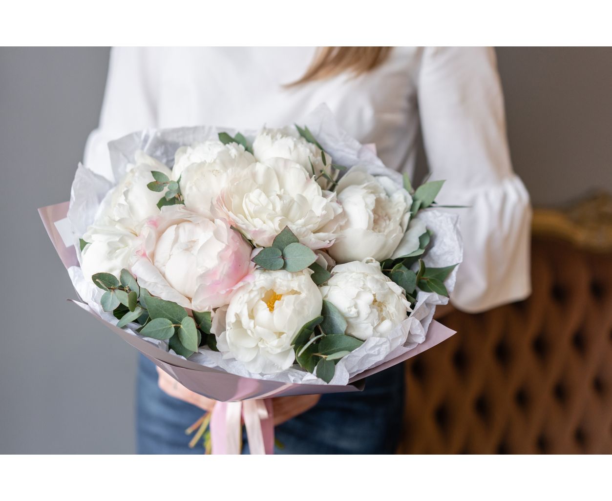 Flori incluse: 15 bujori albi premium, atent selecționați