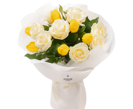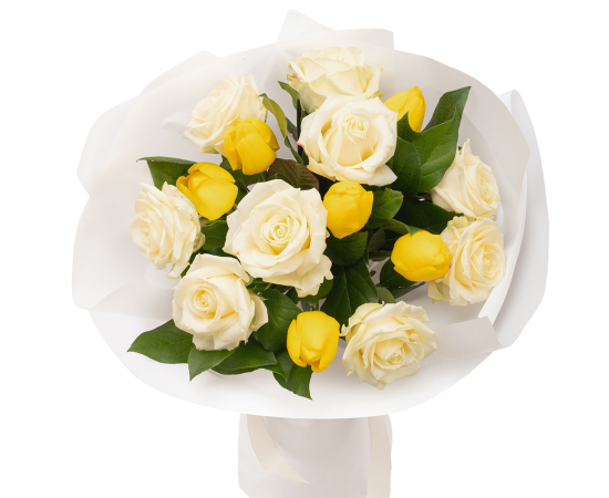 Un buchet delicat și luminos, realizat din 9 trandafiri albi proaspeți și 6 lalele galbene, perfect pentru a transmite bucurie, sinceritate și gânduri pozitive.