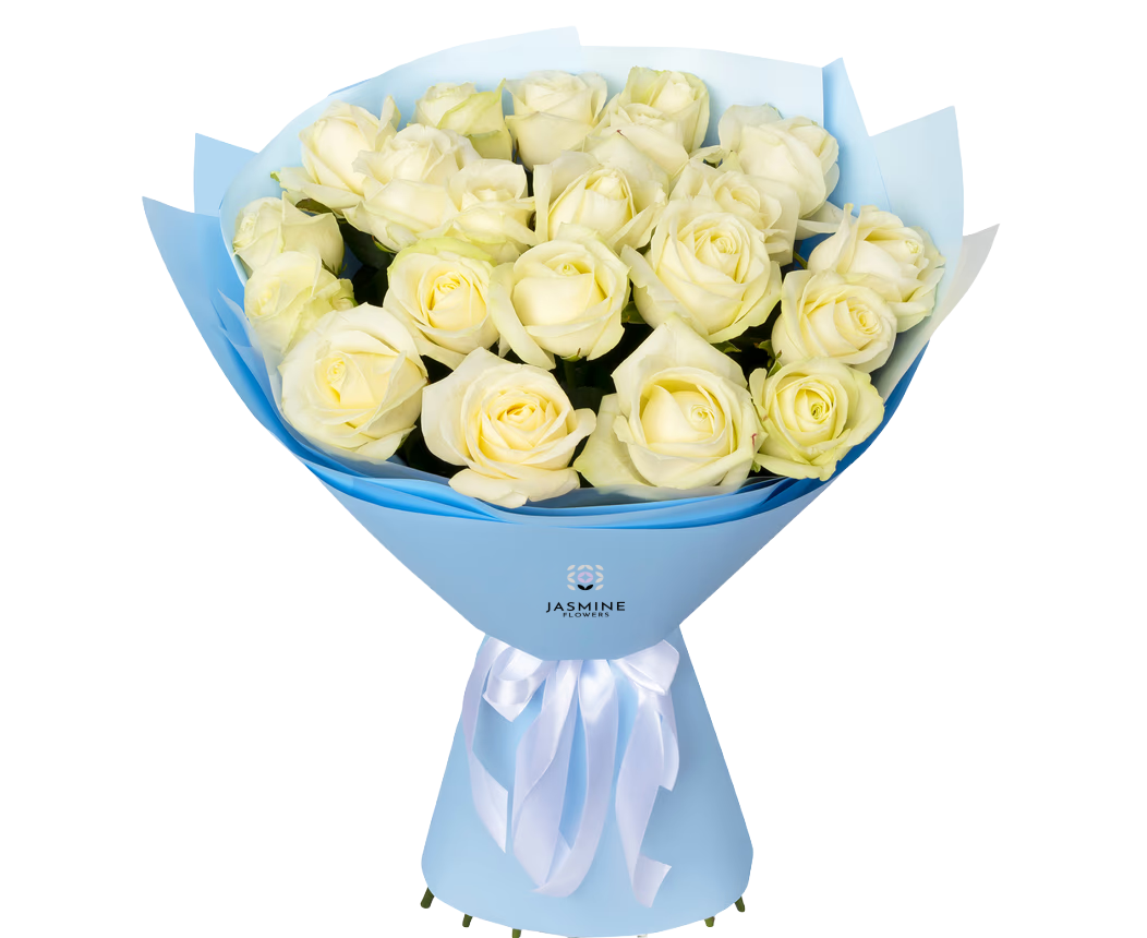 Buchet cu 21 trandafiri „Eleganță Albă”