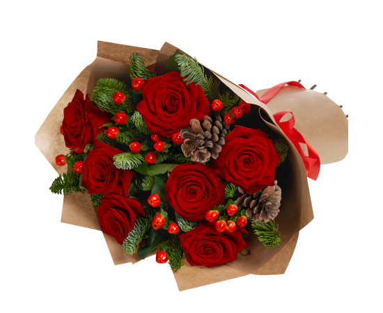 Buchet de Crăciun cu 7 trandafiri roșii, nobilis, hypericum și decor festiv