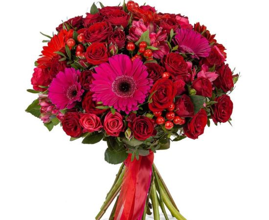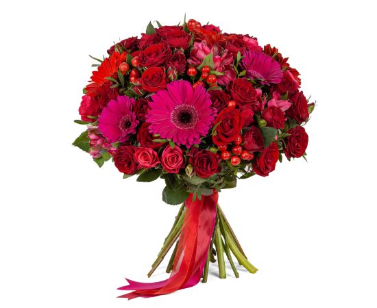 Un buchet vesel și plin de culoare, creat pentru a aduce energie pozitivă și bucurie în orice moment. Buchetul conține 9 miniroze delicate, 6 gerbera vibrante, 5 alstroemeria elegante, 5 fire de hypericum și este completat cu verdeața luxuriantă de salal și pistacia, ce oferă volum și prospețime naturală.