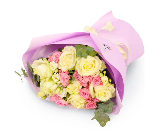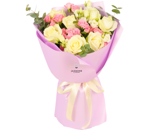 Celebrează momente speciale cu acest buchet elegant, realizat cu grijă pentru a aduce bucurie și frumusețe. Include 7 trandafiri albi proaspeți, 4 ramuri de miniroze roz și 2 eustoma albe, completate de verdeață proaspătă și accente decorative. Este perfect pentru zile de naștere, aniversări sau pur și simplu pentru a transmite iubire și apreciere. Fiecare buchet este creat pentru a exprima eleganță și delicatețe.