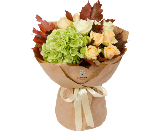 Acest buchet rafinat îmbină nuanțe delicate și texturi vibrante, creând un aranjament elegant, modern și armonios. Trandafirii crem și albi aduc finețe și puritate, iar hortensia verde oferă volum și prospețime. Frunzele de quercus completează buchetul cu accente naturale, iar decorul atent ales îi conferă un aspect sofisticat, perfect pentru a transmite un mesaj de apreciere, iubire sau mulțumire.