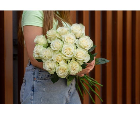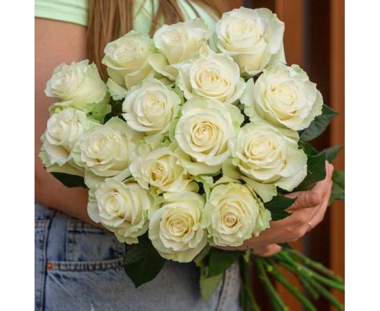 • 15 trandafiri albi premium – proaspeți, cu petale fine și aspect impecabil.