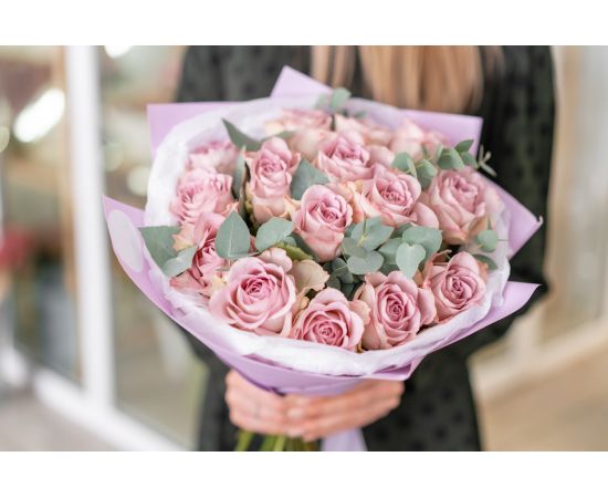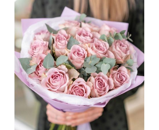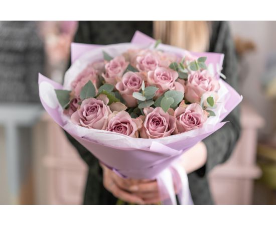 Buchet de flori cu 15 trandafiri roz-lila – rafinament și tandrețe într-o singură privire