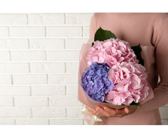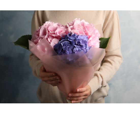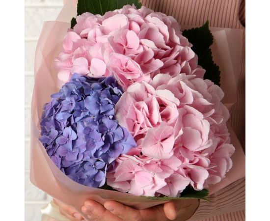Acest buchet cu hortensii roz și mov este alegerea perfectă pentru a aduce un strop de eleganță și unicitate în orice moment special.