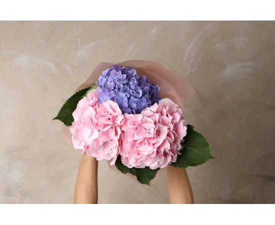 Buchet de flori cu 3 hortensii (2 roz și 1 mov)