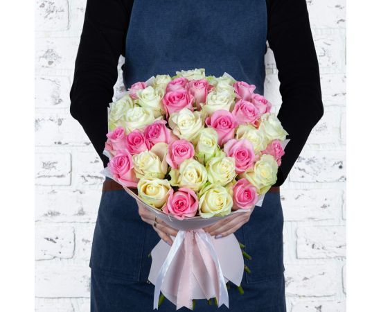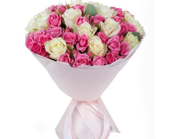 Un aranjament spectaculos, alcătuit din 51 de trandafiri în nuanțe delicate de alb și roz, ce îmbină eleganța purității cu frumusețea gingașă a romantismului. Trandafirii albi transmit sinceritate, respect și noblețe, iar cei roz adaugă un strop de tandrețe, recunoștință și afecțiune.