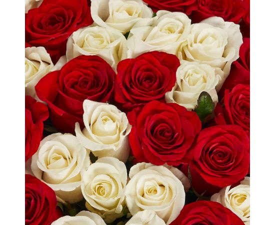 Buchetul cu 51 de trandafiri roșii și albi este simbolul unei iubiri complete — pasiune și sinceritate în același timp.