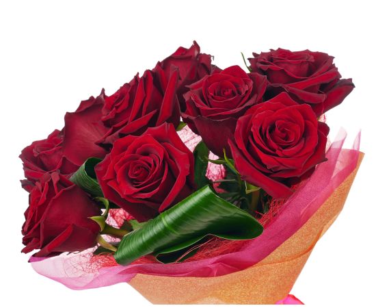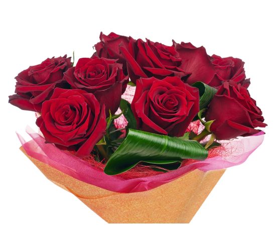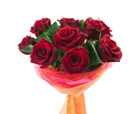 Buchet cu 9 trandafiri roșii și frunze Aspidistra