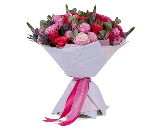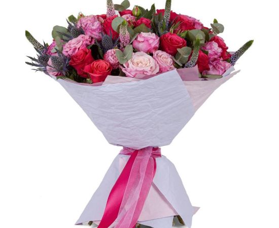 Buchet de flori cu 31 Trandafiri, 7 Veronica, 3 Eryngium și Eucalipt