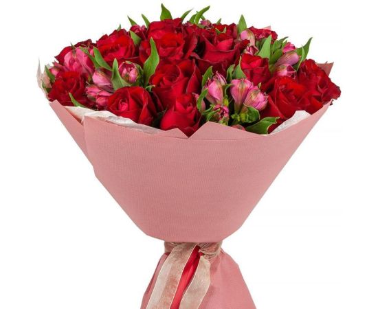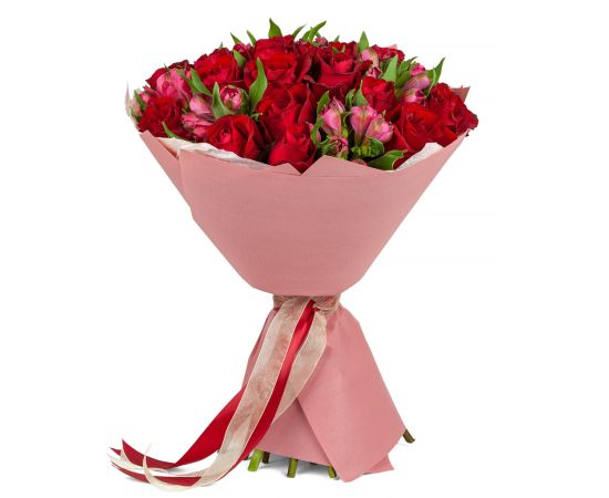 Un buchet spectaculos, plin de pasiune și delicatețe, alcătuit din 17 trandafiri roșii, simbol etern al iubirii intense, armonios combinați cu 8 fire de alstroemeria roz, cunoscute și sub numele de „crini peruvieni”, ce aduc o notă jucăușă și rafinată. Contrastul dintre roșul pasional al trandafirilor și rozul delicat al alstroemeriei creează un efect vizual deosebit, perfect pentru a transmite dragoste, admirație și afecțiune sinceră.