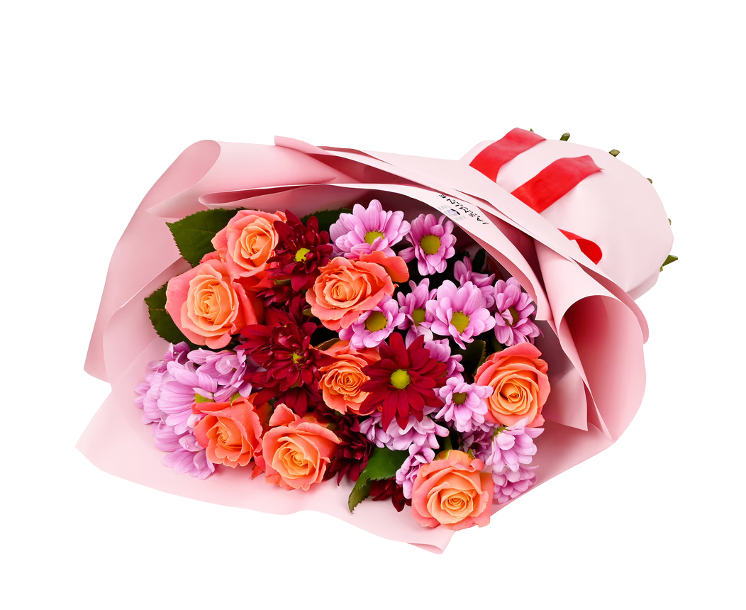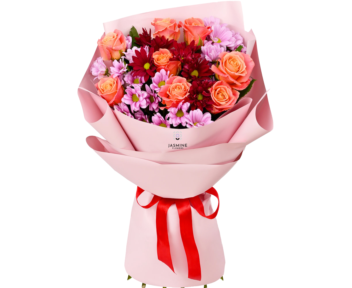 Un buchet plin de farmec și culoare, care îmbină energia caldă a trandafirilor coral cu tonurile bogate ale crizantemelor roz și burgundy. Rezultatul este un aranjament floral elegant și vibrant, ce transmite emoție, optimism și rafinament în același timp.