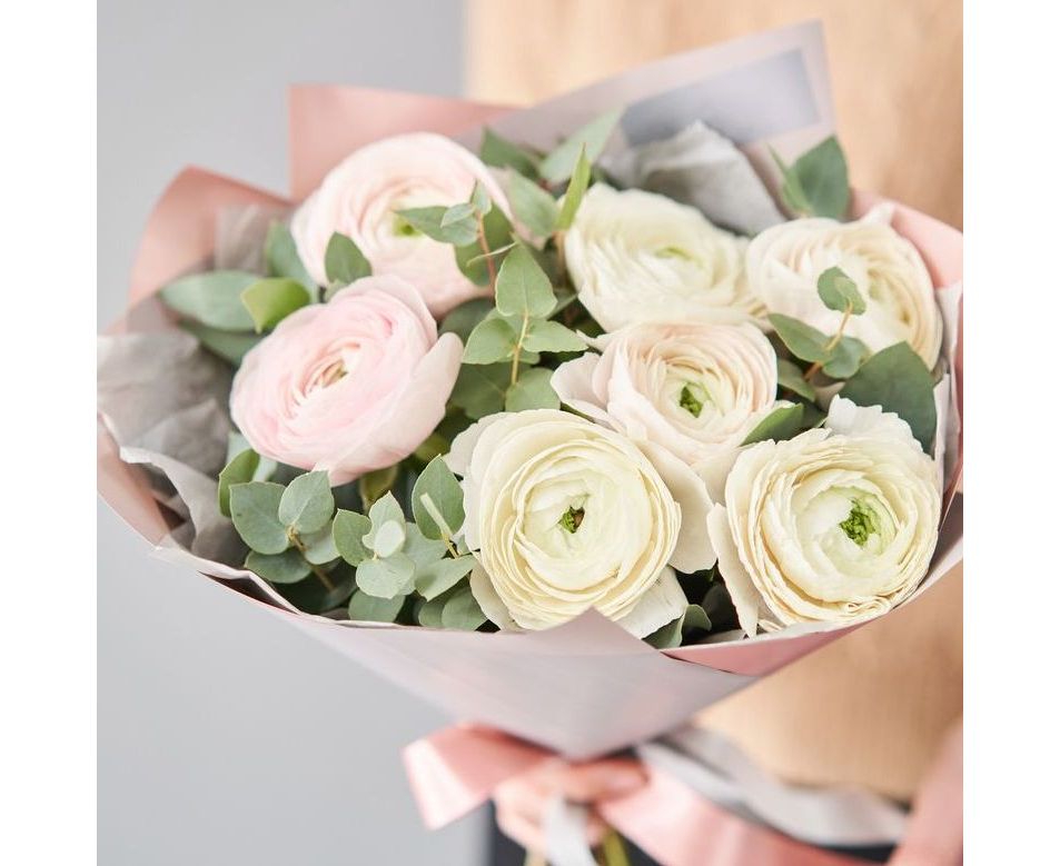 Buchet de flori cu 7 Ranunculus și Eucalipt – Delicatețe naturală și eleganță pură