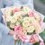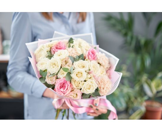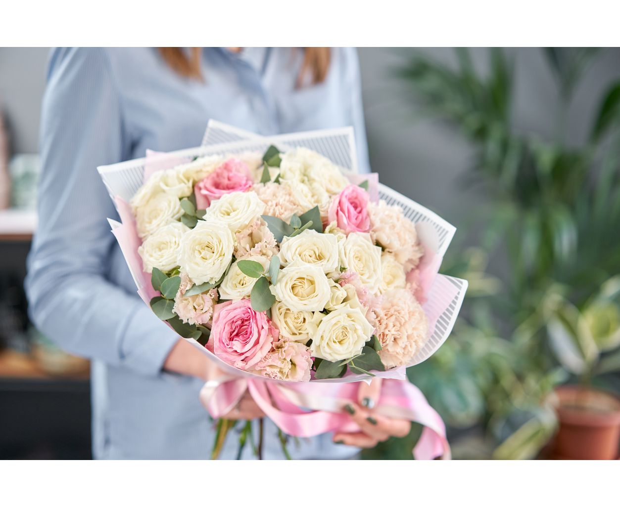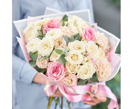 Un buchet care cucerește prin delicatețea culorilor și armonia perfectă dintre flori. Combinând 17 trandafiri eleganți, 8 lisianthus rafinate și frunze verzi de eucalipt, acest aranjament floral transmite naturalețe, prospețime și emoție pură.