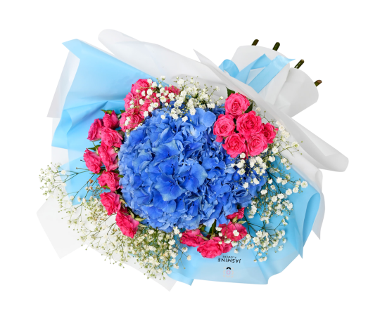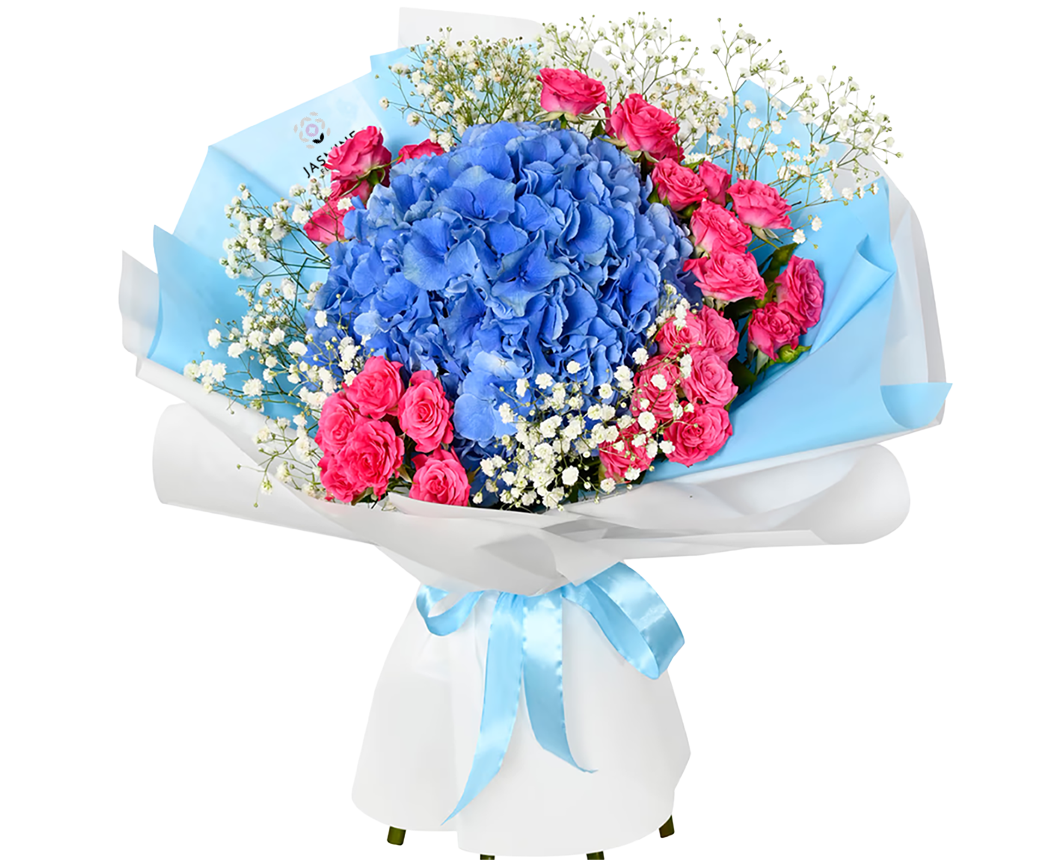 Un buchet spectaculos, plin de delicatețe și armonie cromatică. Hortensia albastră, cu volumul său generos și nuanța sa unică, se îmbină perfect cu minirozele roz pastel, simbol al tandreței și al bucuriei. Accentele de gypsophila oferă un aer diafan, completând compoziția cu rafinament și echilibru vizual.