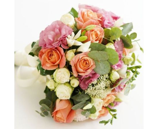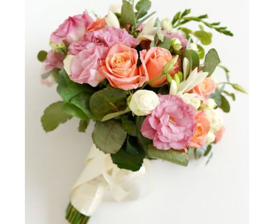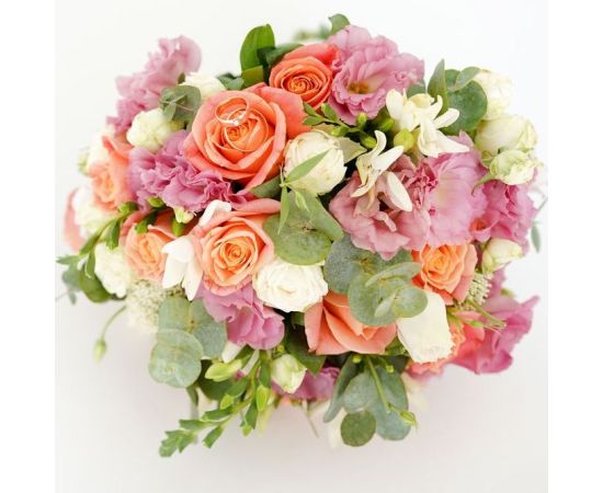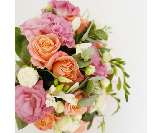Un cadou floral de poveste, creat pentru a onora eleganța și rafinamentul unei persoane speciale. Buchetul conține 10 trandafiri, simbol al respectului și al dragostei pure, 5 miniroze delicate, 5 lisianthus catifelați și 5 frezii parfumate, toate completate de frunziș proaspăt de salal și eucalipt, care adaugă volum și prospețime.