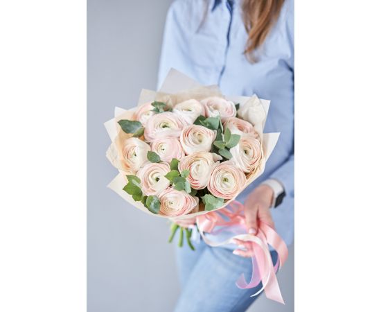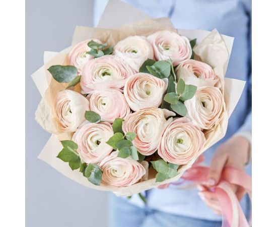 Un buchet ce cucerește prin rafinament, textură și naturalețe. Format din 13 flori de Ranunculus, cunoscute pentru petalele lor delicate și forma perfect rotundă, completate de accente verzi de eucalipt proaspăt, acest aranjament floral emană eleganță și prospețime pură.