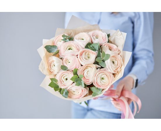 Buchetul cu 13 ranunculus și eucalipt este o poezie florală în care delicatețea se împletește cu naturalețea. Fiecare ranunculus pare o floare desprinsă dintr-un vis romantic, în timp ce eucaliptul adaugă un strop de prospețime calmă. Împreună, creează o compoziție ce inspiră echilibru, seninătate și iubire sinceră — cadoul perfect pentru a spune “Mulțumesc”, “Te iubesc” sau “Mă gândesc la tine”.