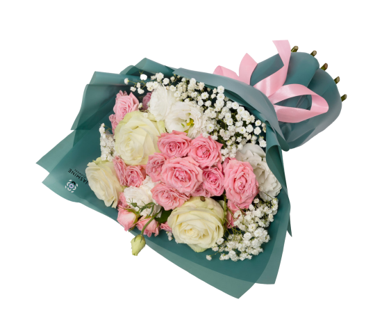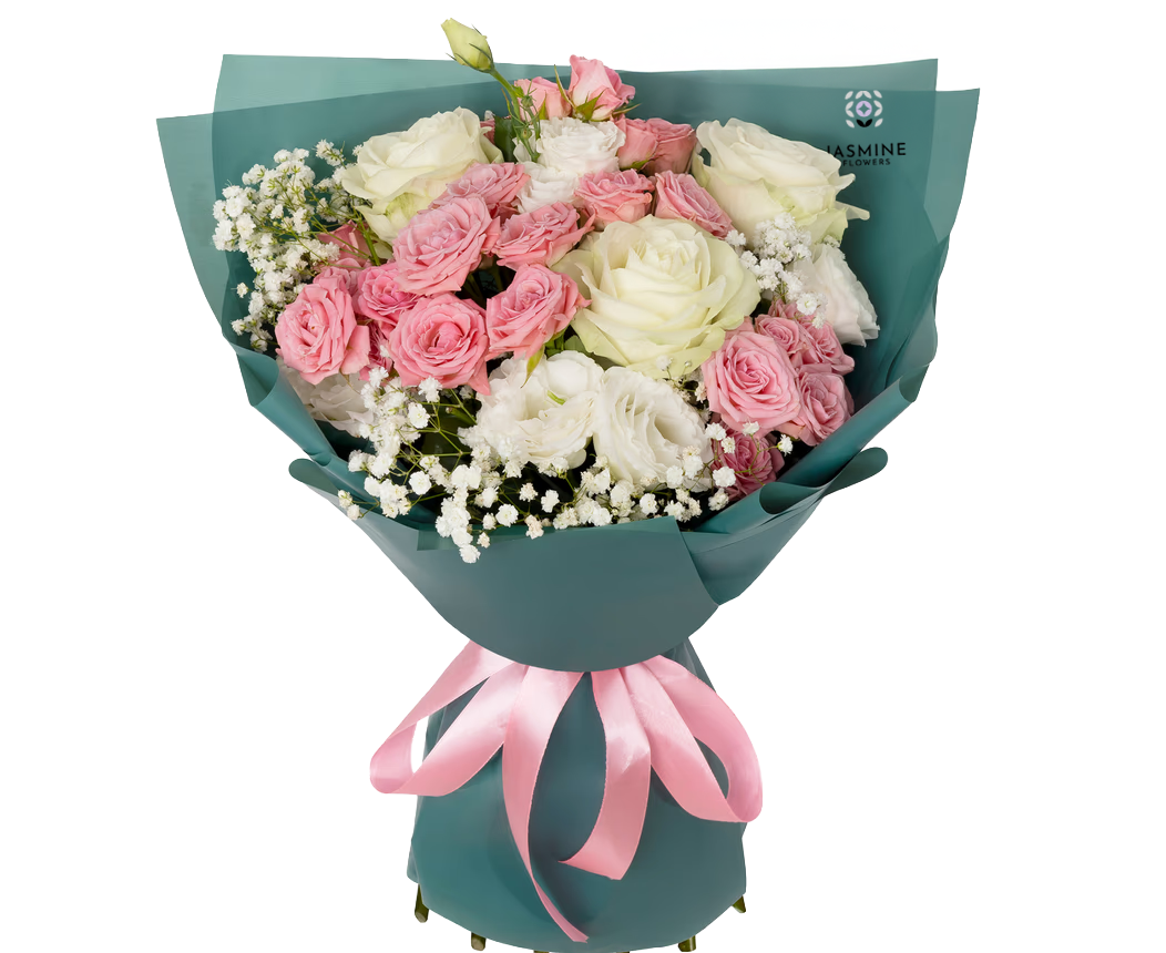 Un buchet ce emană delicatețe și rafinament, perfect pentru a exprima sentimente sincere și gesturi de afecțiune. Combinația dintre trandafirii albi, simbol al purității, și minirozele roz, simbol al gingășiei, creează un contrast armonios, completat de lisianthus alb și accente fine de gypsophila.
