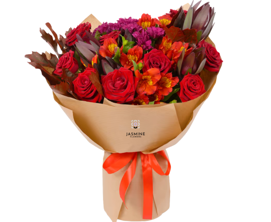 Mixul dintre trandafirii roșii, alstroemeria delicată, crizantemele burgundy, leucodendronul exotic și frunzele de quercus oferă un aer luxuriant și în același timp autentic de toamnă. Ideal pentru cadouri elegante, surprize romantice sau momente în care vrei să creezi o atmosferă specială.