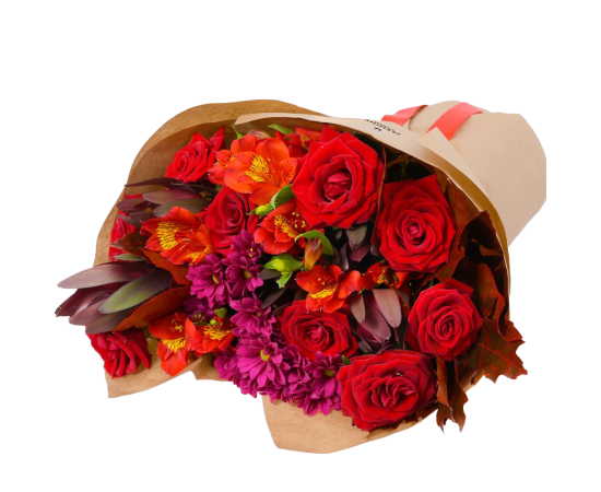 Buchet de Toamnă „Red Autumn Harmony” – 9 Red Roses, Alstroemeria, Burgundy Chrysanthemums & Leucodendron