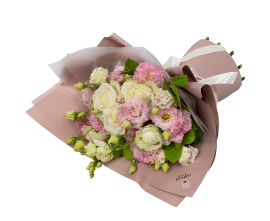 Un buchet rafinat, cu o cromatică blândă și echilibrată, ce îmbină puritatea trandafirilor albi cu delicatețea eustomelor roz. Rezultatul este o compoziție florală plină de grație, potrivită pentru a exprima admirație, recunoștință sau dragoste sinceră.