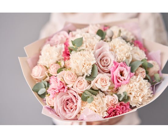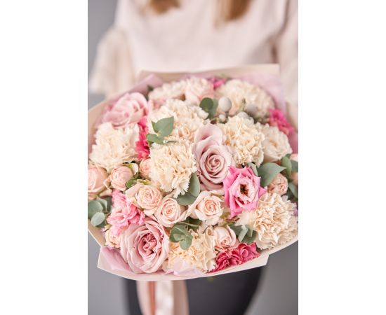 Buchet de flori cu trandafiri, miniroze, lisianthus, garoafe și eucalipt – Armonie de eleganță și culoare