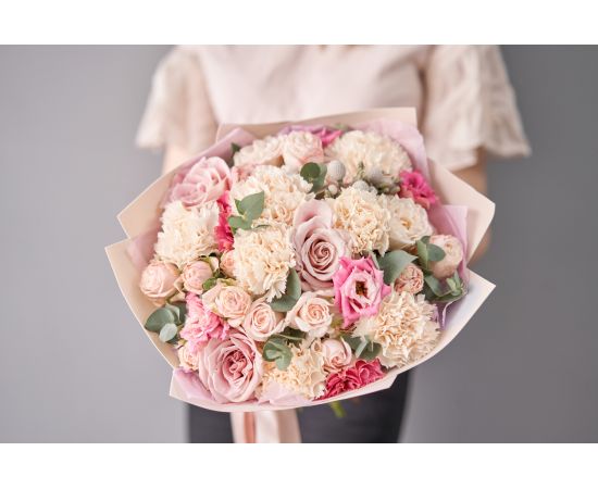 Buchetul de flori cu trandafiri, miniroze, lisianthus, garoafe și eucalipt este o celebrare a iubirii, a gingășiei și a frumuseții pure. Fiecare floare adaugă o notă distinctă: trandafirii vorbesc despre pasiune, minirozele despre tandrețe, lisianthusul despre eleganță, iar garoafele aduc un parfum clasic și reconfortant. Este buchetul ideal pentru a exprima afecțiunea sinceră, recunoștința sau bucuria de a dărui.