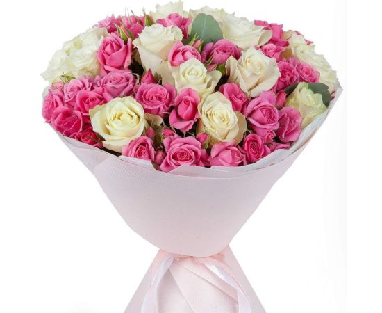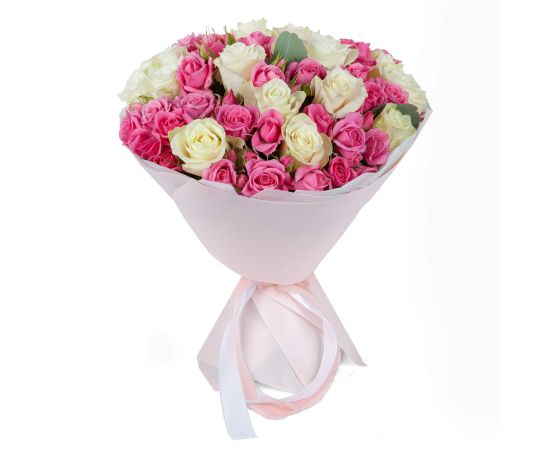 Acest buchet rafinat combină puritatea și eleganța celor 15 trandafiri albi cu delicatețea jucăușă a celor 10 miniroze roz, toate îmbrățișate de frunzele proaspete de eucalipt. Alb imaculat și roz tandru se completează perfect, creând un aranjament ce exprimă dragoste sinceră, admirație și afecțiune caldă. Trandafirii albi simbolizează inocența și respectul, în timp ce minirozele roz adaugă o notă romantică și plină de farmec, iar eucaliptul oferă prospețime și un parfum discret.