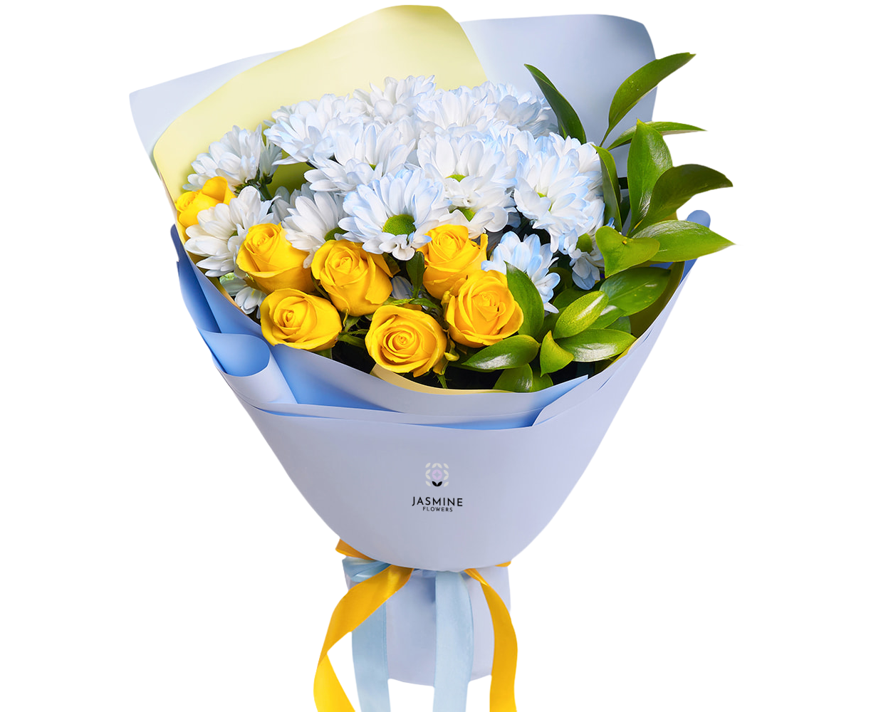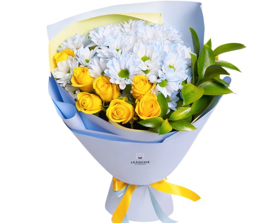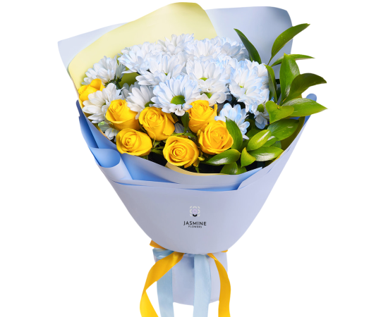 Buchet luminos și plin de prospețime, realizat din 7 trandafiri galbeni, completat de 4 fire de crizantemă albă tip mușețel, greenery proaspăt și elemente decorative fine. Contrastul dintre galbenul cald și albul delicat oferă un aer vesel, solar, perfect pentru a transmite energie pozitivă și bună dispoziție. Este un buchet ușor, elegant și potrivit pentru orice moment în care vrei să aduci zâmbete.