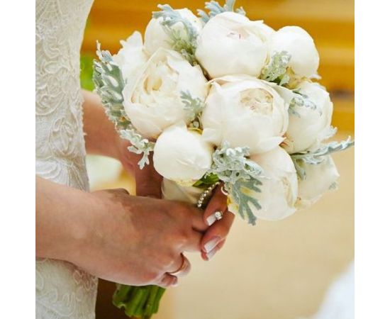 Buchet de mireasă cu bujori albi și senecio cineraria