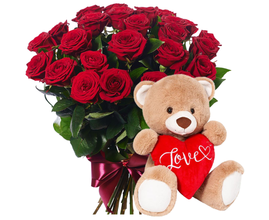Buchet „Red Passion” cu 25 trandafiri roșii și Ursuleț de plus „Valentine” 30 cm