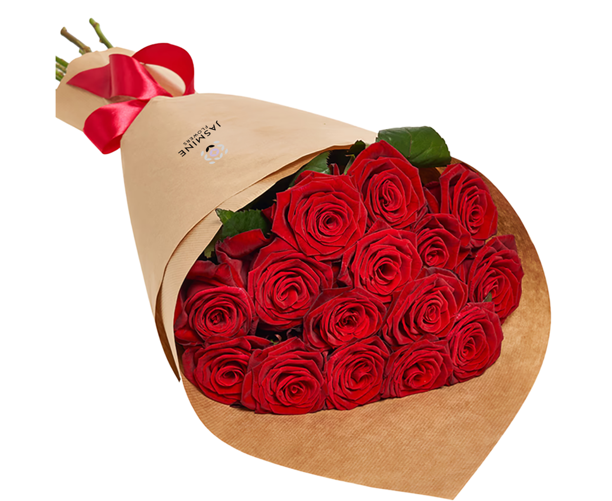 Un buchet clasic, elegant și plin de pasiune – buchetul cu 15 trandafiri roșii și ambalaj craft este simbolul iubirii autentice.