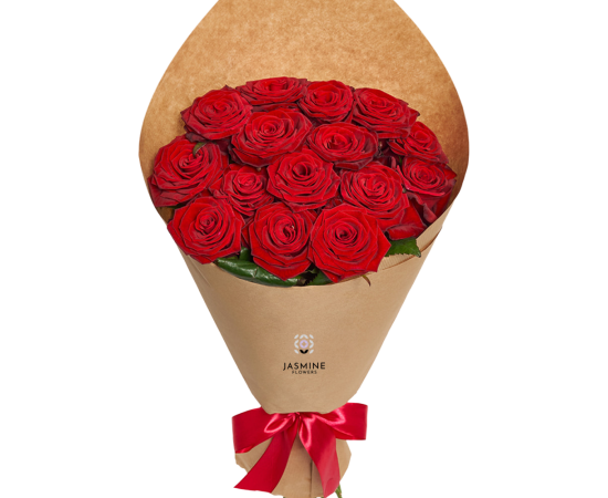 Buchet cu 15 trandafiri roșii și ambalaj craft