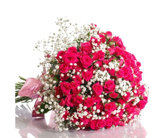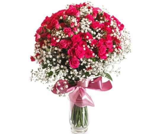 Designul său echilibrat, cu un contrast subtil între bogăția minirozelor și finețea gypsophilei, face ca acest buchet să fie o alegere elegantă și memorabilă.